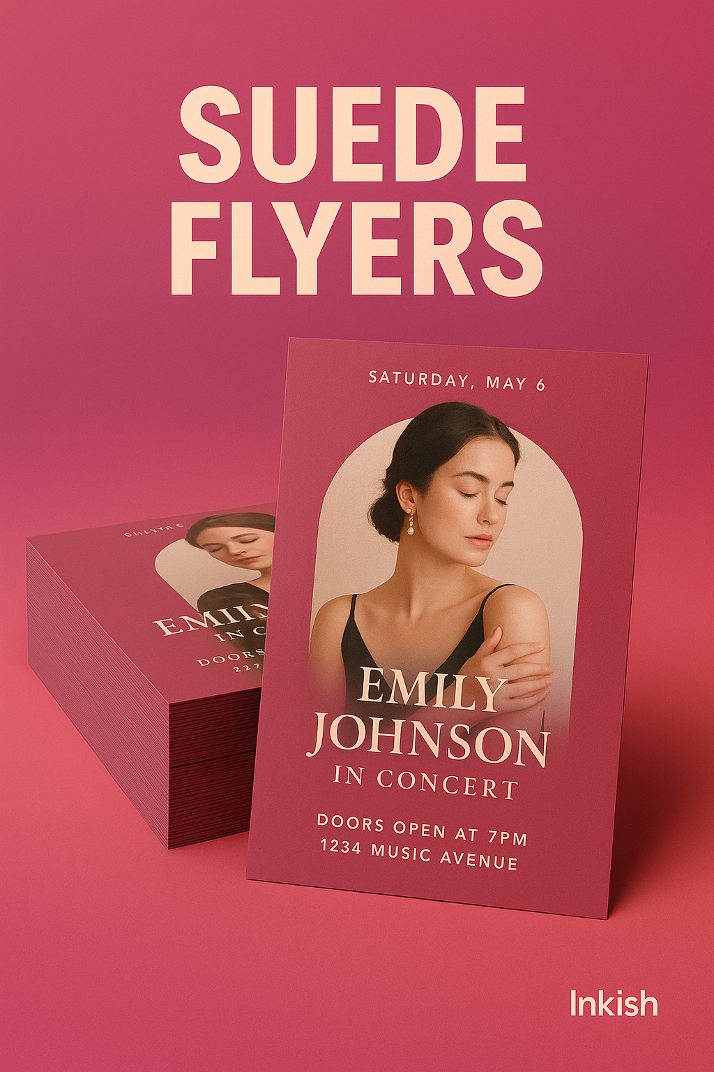 Experience premium texture and style with Suede Flyers from Inkish Studios. These soft-touch, velvety prints elevate any brand, perfect for high-end events, boutiques, and designers seeking an unforgettable feel.